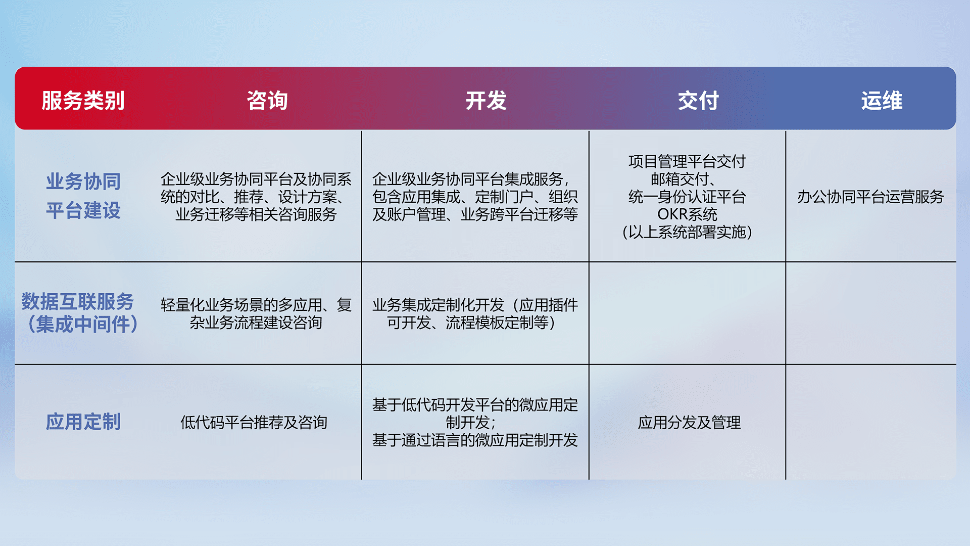 针对钉钉、、、、企微、、、、IDaas等平台级产品提供产品的规划、、、方案、、交付、、、定制化开发等服务,,,,实现如统一协同办公、、、、智能客户服务、、、混合会议管理、、、智能数据查询、、等业务场景,,实现数字化转型。。